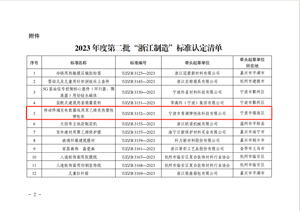 寧波市青湖彈性體科技有限公司牽頭起草的《移動(dòng)終端充電數(shù)據(jù)線用苯乙烯類熱塑性彈性體》T/ZZB 3152—2023浙江制造團(tuán)體標(biāo)準(zhǔn)名列其中。