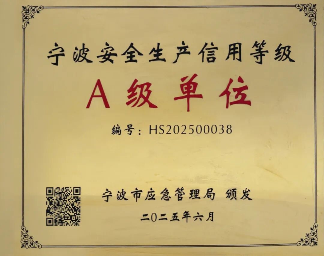 成功斬獲“寧波市安全生產(chǎn)信用等級A級”榮譽,這是寧波市對市場主體安全生產(chǎn)綜合能力的最高級別認(rèn)可。